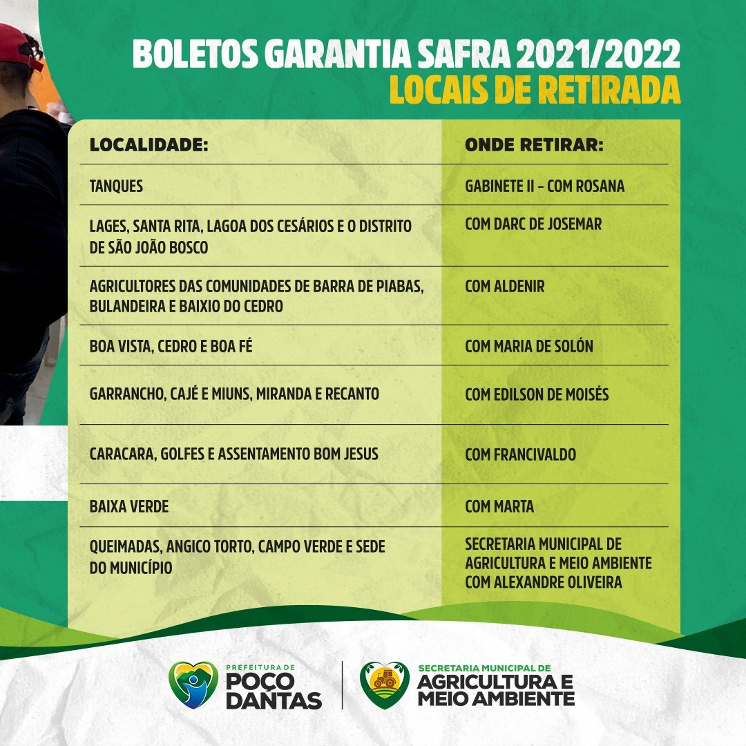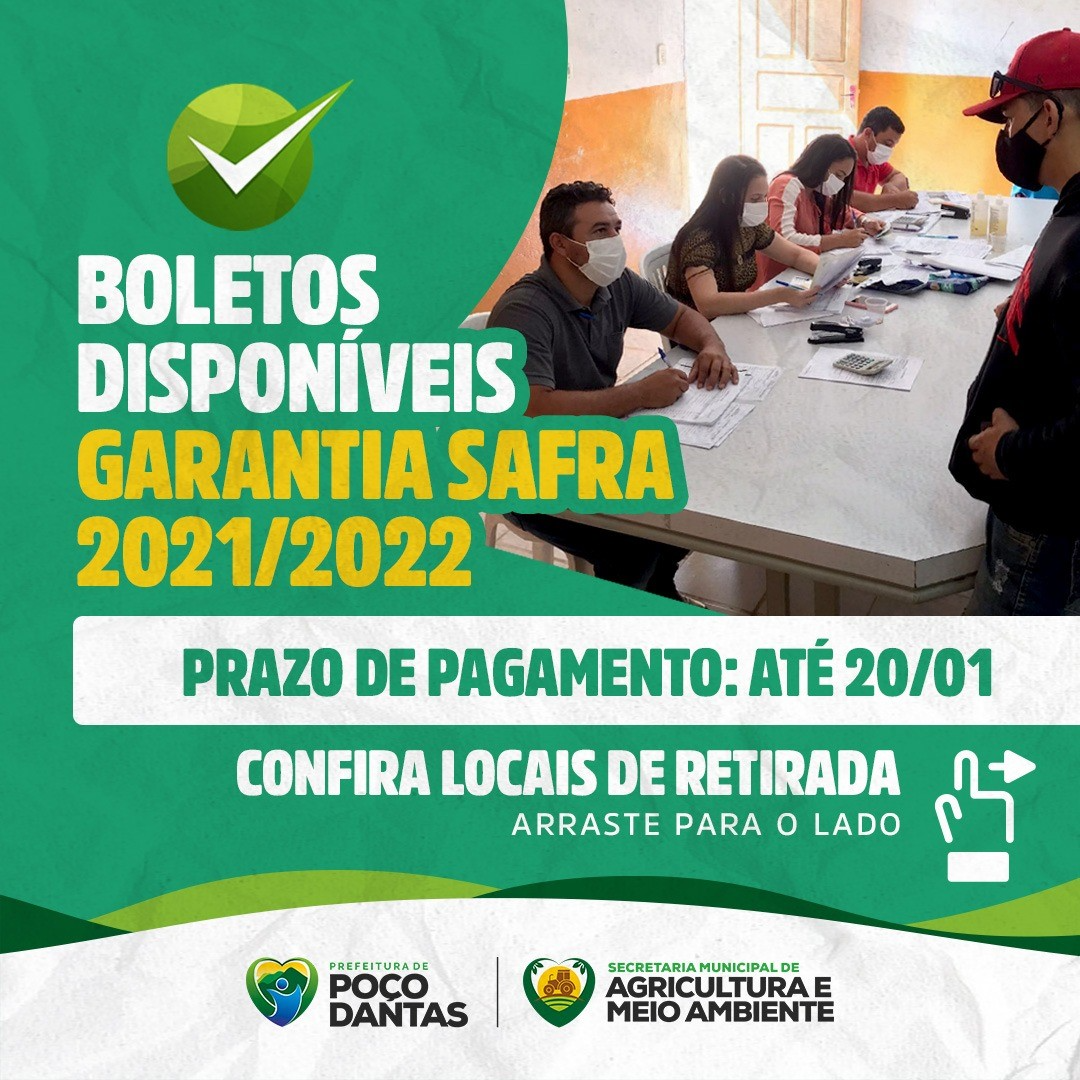 Os agricultores do município de Poço Dantas cadastrados no Programa Garantia Safra 2022 já podem retirar os seus boletos para realizar o pagamento da adesão ao programa. O informe foi feito pelo Secretário Municipal de Agricultura e Meio Ambiente, Alexandre Oliveira, na manhã da última terça-feira (4).