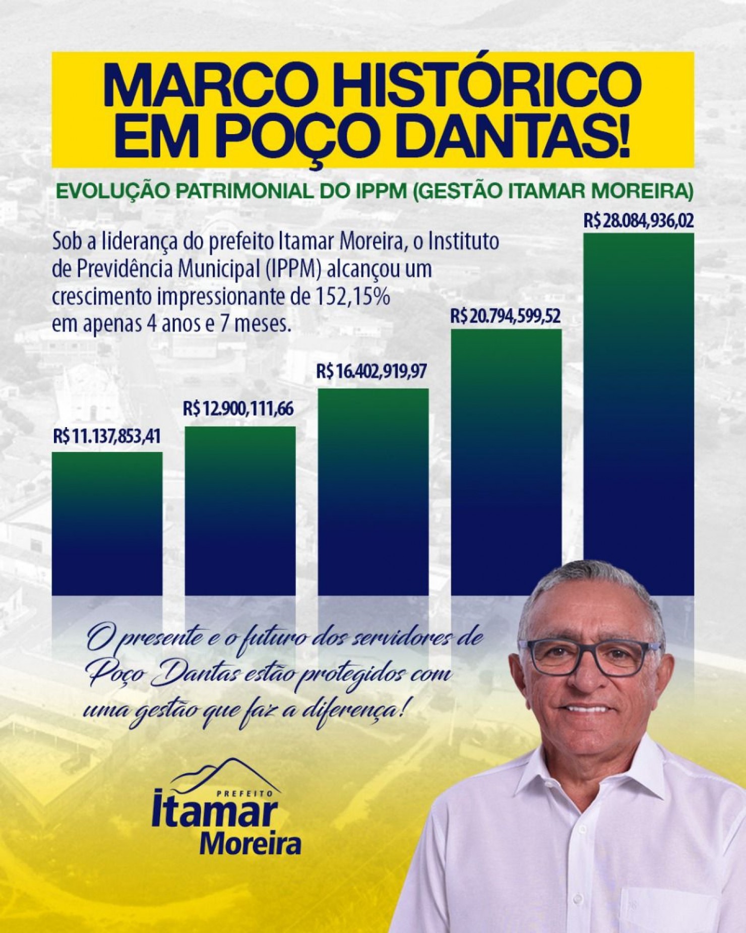 Sob a liderança do prefeito Itamar Moreira, o Instituto de Previdência Municipal (IPPM) alcançou um crescimento impressionante de 152,15% em apenas 4 anos e 7 meses. 🚀