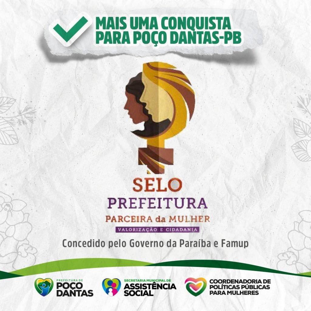 O Município de Poço Dantas foi contemplado com o Selo Social "Prefeitura Parceira das Mulheres" promovido pelo Governo do Estado, nesta edição, um total de 85 cidades participaram, das quais 47 entraram na fase final de seleção e 43 cidades serão premiadas.