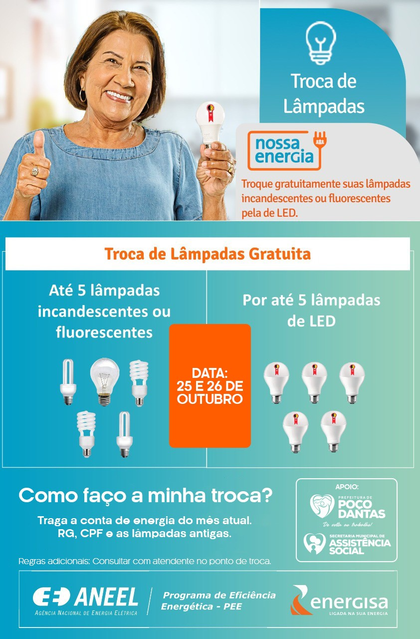 O projeto “Nosso Energia” vai possibilitar a troca de lâmpadas gratuitas e inscrição de famílias de baixa renda na Tarifa Social de Energia, entre outras ações de conscientização para um consumo de energia adequado. Para a troca de lâmpadas, cada pessoa poderá levar até 5 lâmpadas incandescentes ou fluorescentes para serem trocadas por lâmpadas de led.