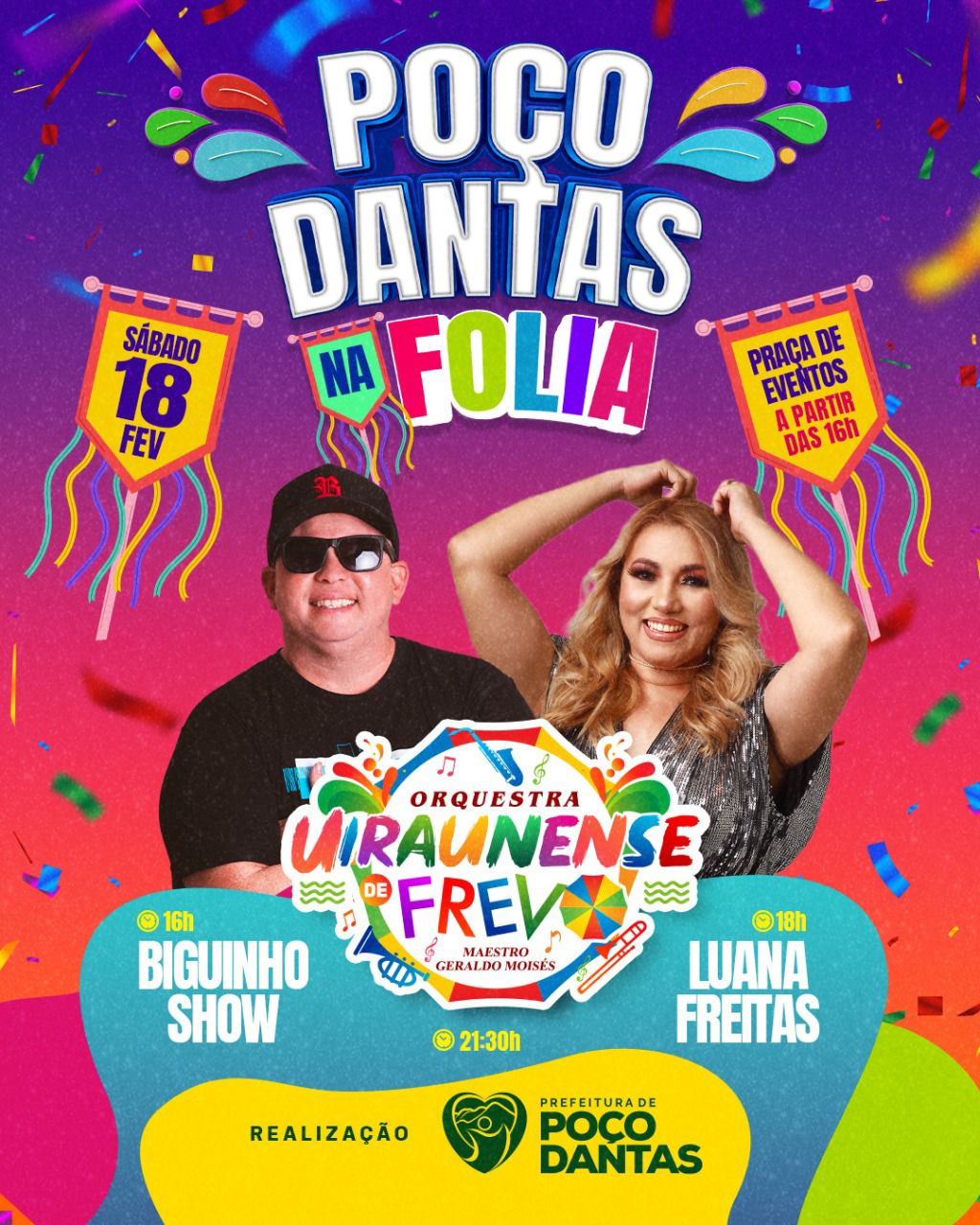 A festa vai acontecer no dia 18/02 (sábado), a partir das 16h. A primeira atração será Biguinho Show, na sequência Luana Freitas e para encerrar a noite de animação a Orquestra Uiraunense de Frevo.