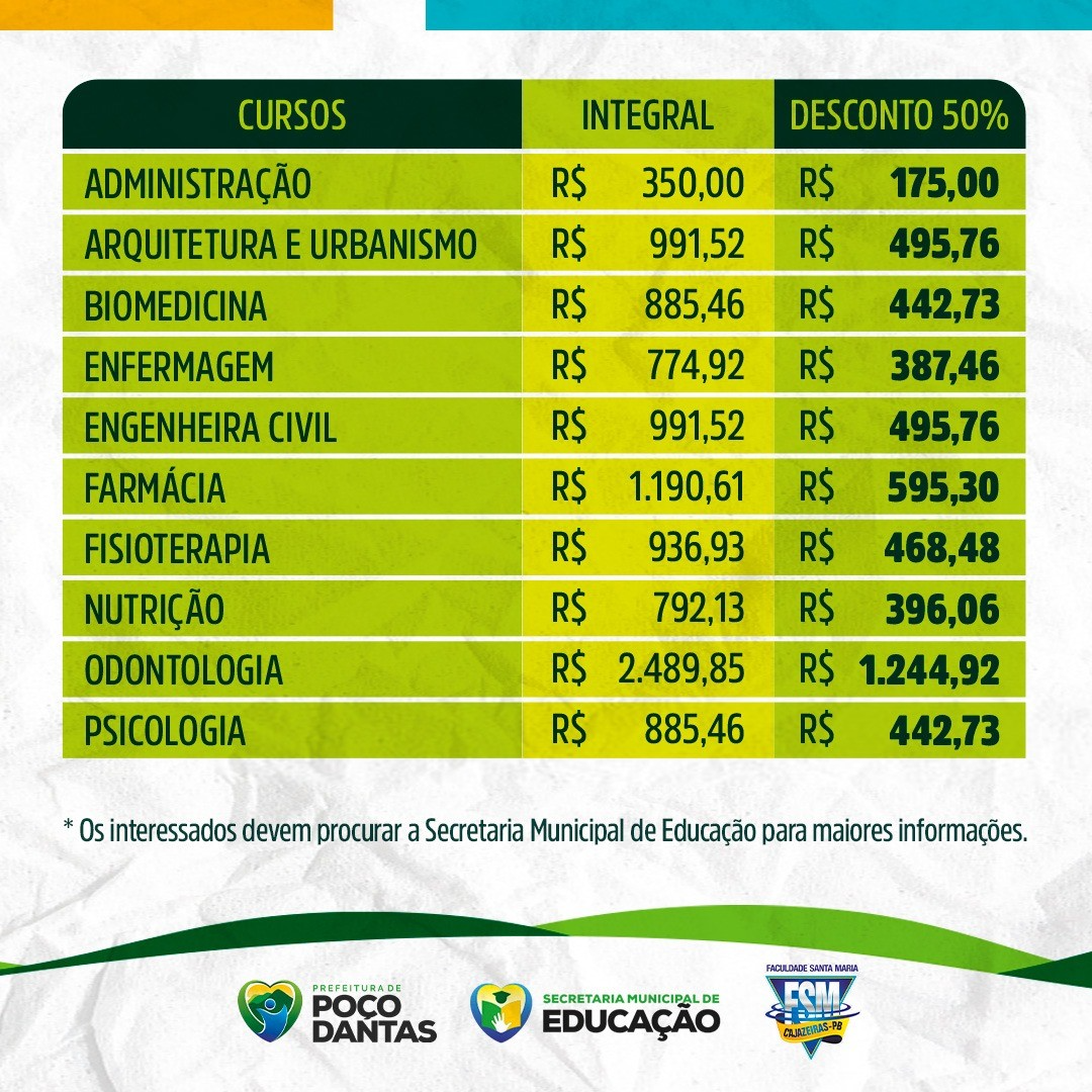 A bolsa de 50% de desconto é válida para os cursos de Administração, Arquitetura e Urbanismo, Biomedicina, Enfermagem, Engenharia Civil, Farmácia, Fisioterapia, Nutrição, Odontologia e Psicologia. Os interessados devem procurar a Secretaria Municipal de Educação até o dia 10 de setembro.