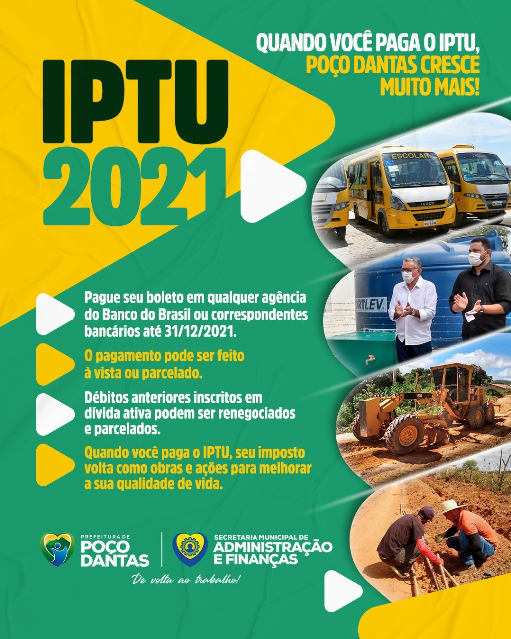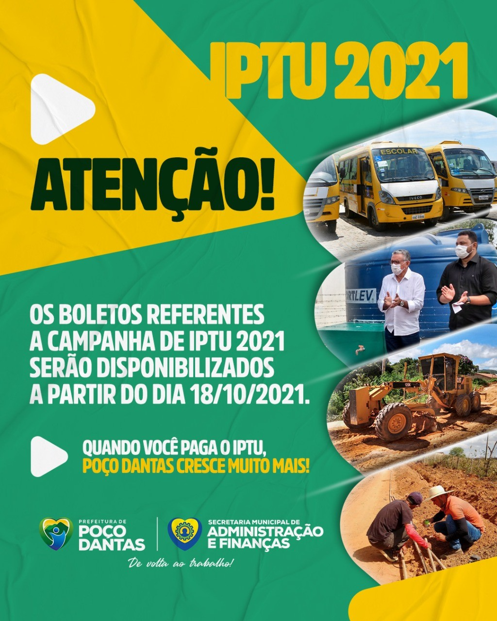 A Prefeitura de Poço Dantas, através da Secretaria de Administração e Finanças, lançou nesta semana a campanha de pagamento para o atual exercício do Imposto Predial Territorial Urbano – IPTU 2021. De acordo com a diretora do setor de Tributação, Fernanda Dias, os carnês serão entregues nas residências dos contribuintes a partir da próxima segunda-feira, dia 18 de outubro.