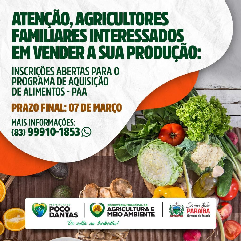 As inscrições dos agricultores familiares que tiverem interesse em vender sua produção estarão sendo realizadas até o dia 07 de março e devem ser realizadas na Secretaria Municipal de Agricultura e Meio Ambiente.