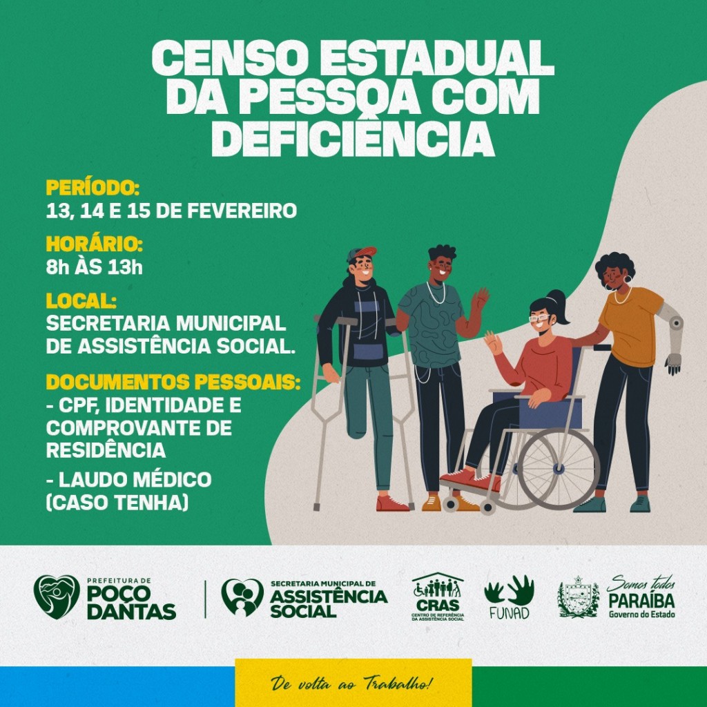 A Prefeitura Municipal de Poço Dantas-PB através da Secretaria Municipal de Assistência Social, vai realizar o Censo Estadual da Pessoa com Deficiência nos dias 13, 14 e 15 de fevereiro, com a finalidade de conhecer melhor o seu universo.