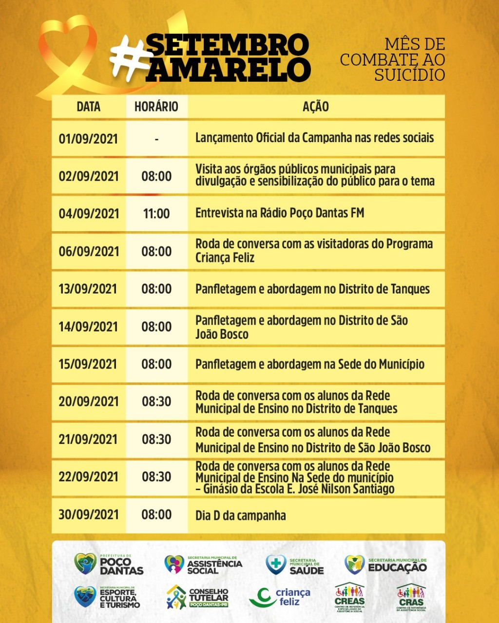 A Prefeitura de Poço Dantas, por meio da parceria entre as Secretarias Municipal de Assistência Social, Saúde, Educação e Esporte, Cultura e Turismo, irá promover durante todo este mês uma programação especial alusiva ao Setembro Amarelo, mês de combate e prevenção ao suicídio.